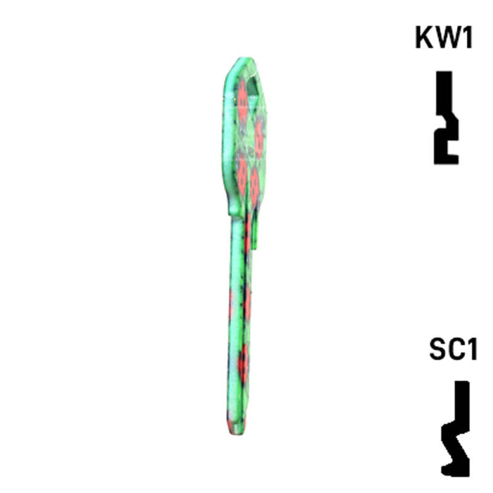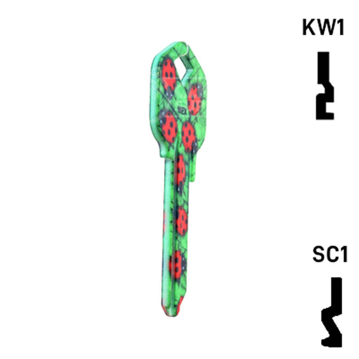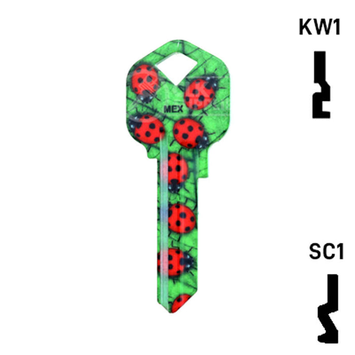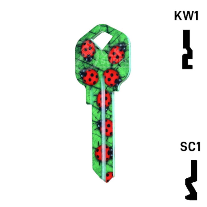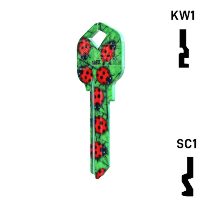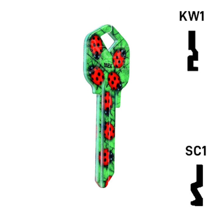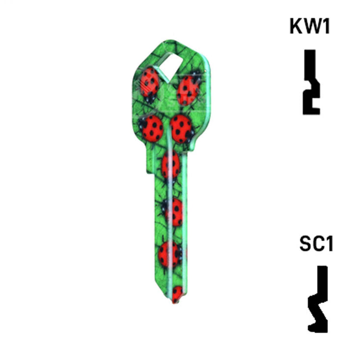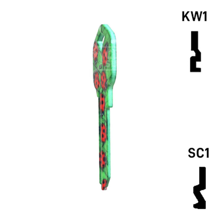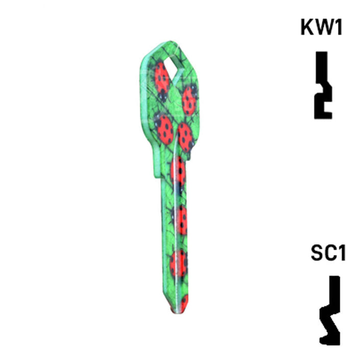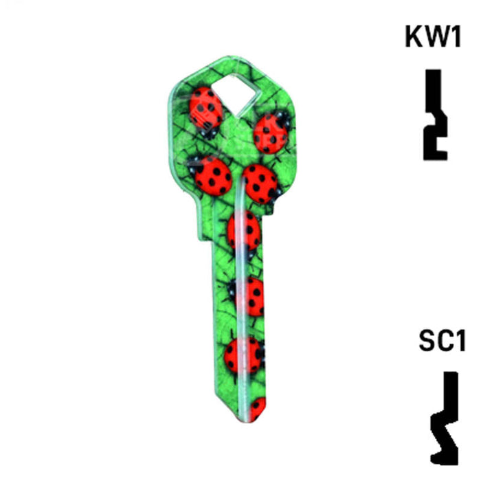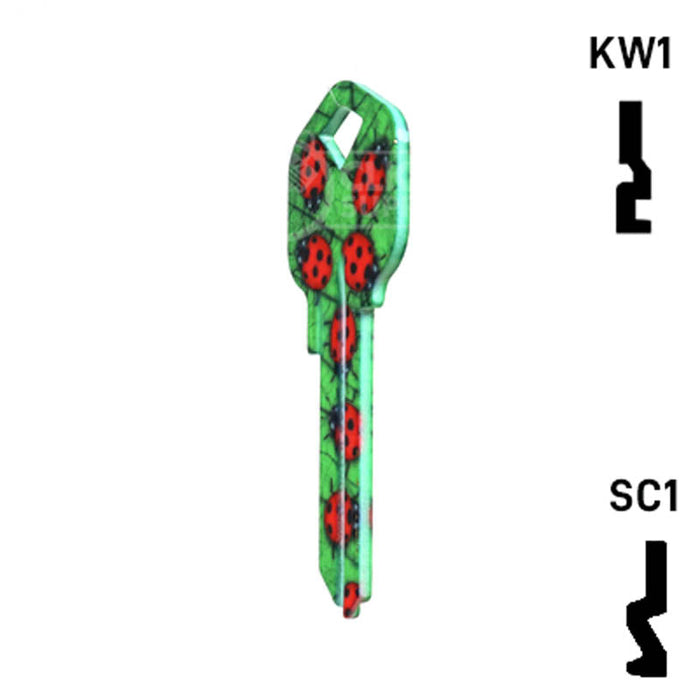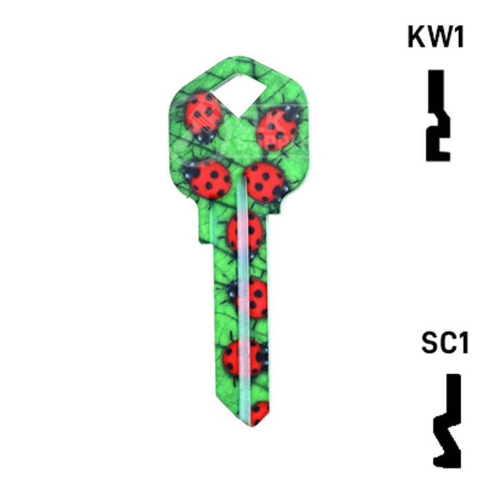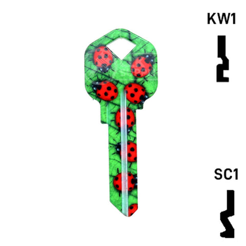 The Uncut Happy Keys Ladybugs Key, a fun and colorful addition to your key cutting offerings. These high-quality keys are printed with a vibrant ladybug design and finished with a durable coating, ensuring they will hold up to daily use. Available in packs of 5, these keys are compatible with Kwikset KW1 and KW10, as well as Schlage SC1 locks.