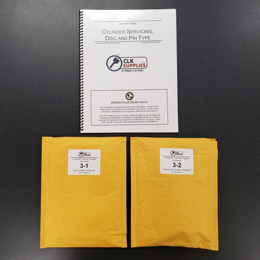 Lesson 3 in the Locksmith Training Program covers cylinder servicing as well as disc and pin types. Envelope 3-1 contains a cam lock, keys and a re...