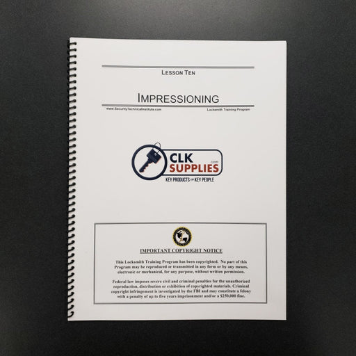 Lesson 10 in the Locksmith Training Program covers impressioning. The envelope for this lesson includes a pippin file, a round cut file, a cam lock...