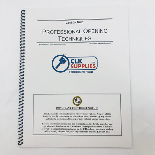 Lesson 9 in the Locksmith Training Program discusses professional opening techniques. This chapter will assist you in learning and practicing diffe...